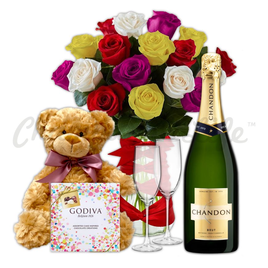Celebrate a birthday the right way with the Birthday Celebration Gift Package. The Birthday Celebration Gift Package features a colorful rose bouquet, paired with Chandon Brut Champagne. Our luxurious flower arrangements are perfect for birthday gifts, wedding gifts, graduation gifts, and anniversary gifts. To design your own custom flower arrangement or custom flower bouquet, complete the CUSTOM ORDER FORM and we will get back to you within 24 hours.