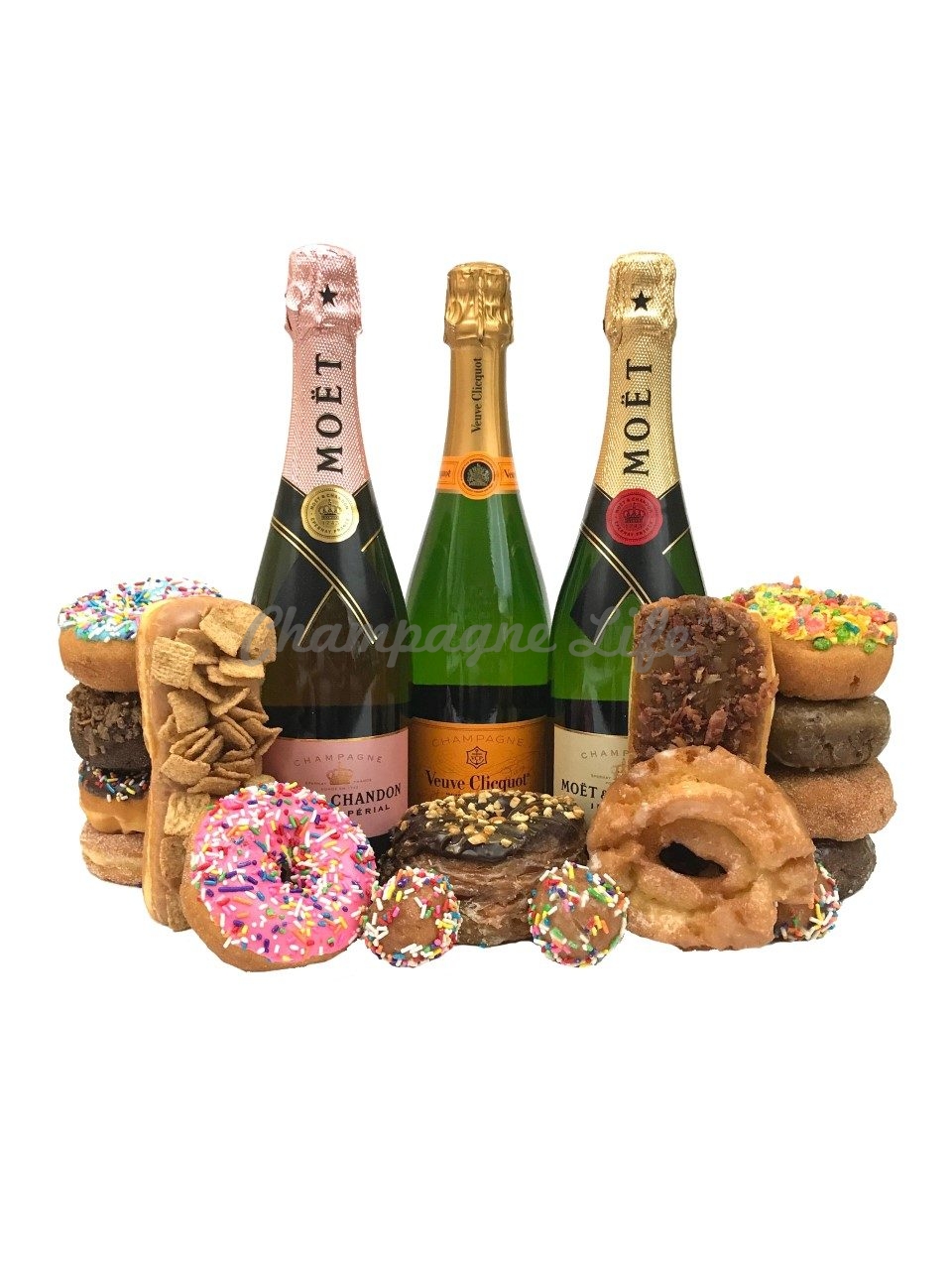 The deluxe champagne and donut gift set includes three bottles of exquisite champagne including Moët & Chandon Imperial Brut, Moët & Chandon Imperial Rosé and Veuve Clicquot Yellow Label Brut and Pink Box Gourmet Donuts for next day delivery in Las Vegas, Nevada. The perfect treat for the office, Las Vegas Tourists, and just to say thank you! Pink Box Donuts are a voted Best of Las Vegas! For other delicious catering options, check out our Cake & Cupcakes and Donut Gifts. Please allow 24 hours for delivery.