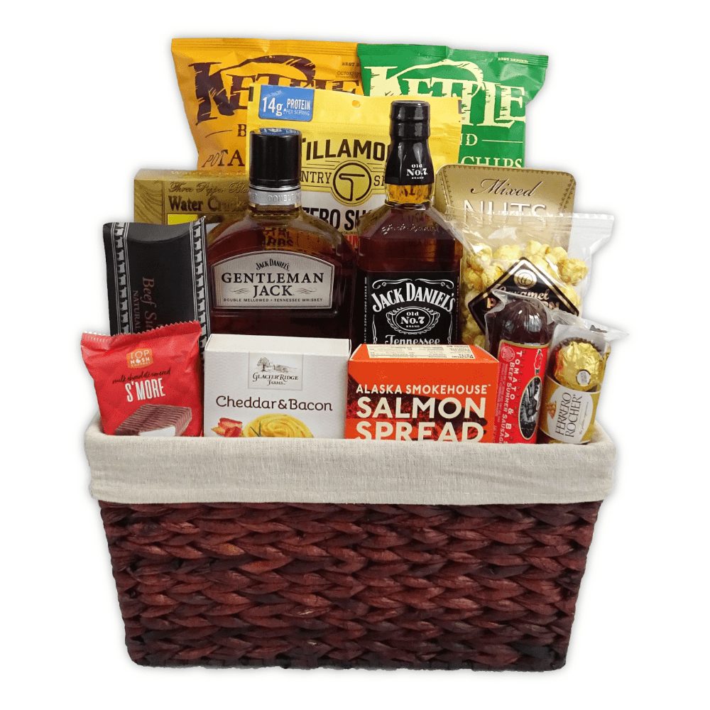 The Deluxe Jack Daniel’s Gift Basket is available for same day delivery in Las Vegas, NV. Featuring Gentleman Jack, Jack Daniels and variety of gourmet salty & sweet snacks. Create your own Custom Whiskey Gift Basket by calling 702-214-1221.