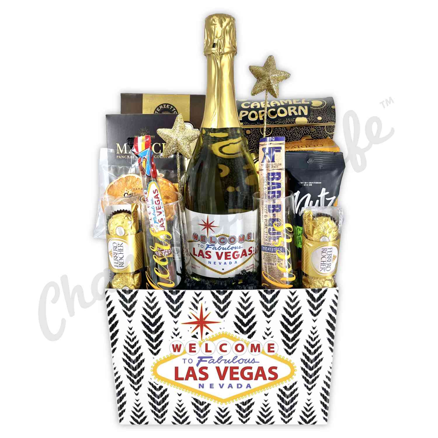Celebrate love and laughter with the Las Vegas Wedding Basket. Weddings in Vegas deserve a little extra sparkle—and this basket delivers. With a bottle of Las Vegas Brut, sweet and savory indulgences, and keepsake flutes for that perfect toast. It’s made for couples saying “I do” in the city of lights. Fun, flashy, and full of flavor. The perfect Vegas love story.